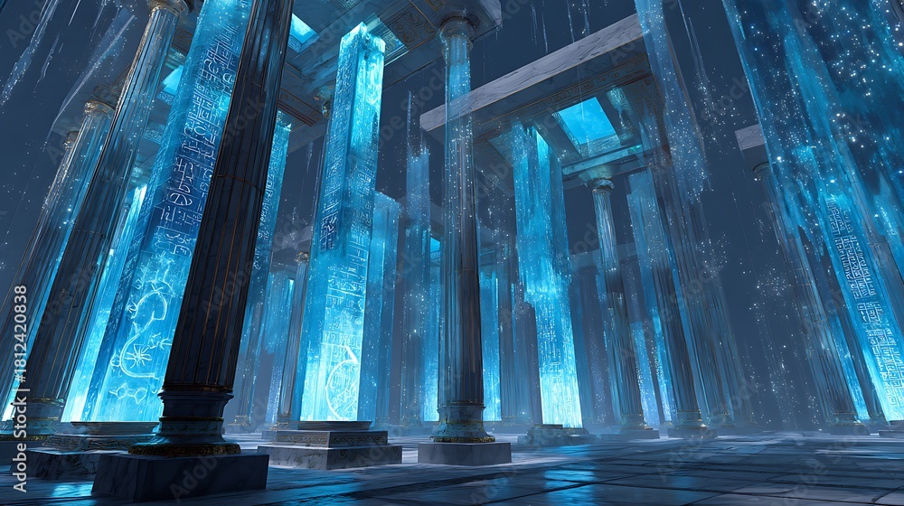 broken marble halls lit by shimmering blue crystals, ancient civilization powered by unknown energy source, particles floating in air, mysterious symbols engraved on pillars #1812420838