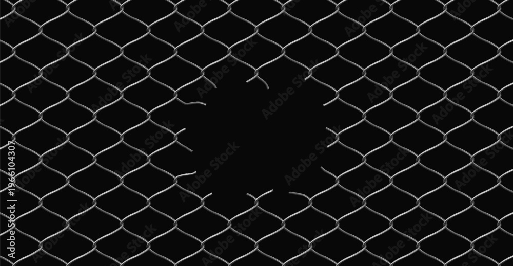 Broken wire net fence vector realistic illustration, steel chain link fence lattice with torn metal damaged barrier hole #1966104307