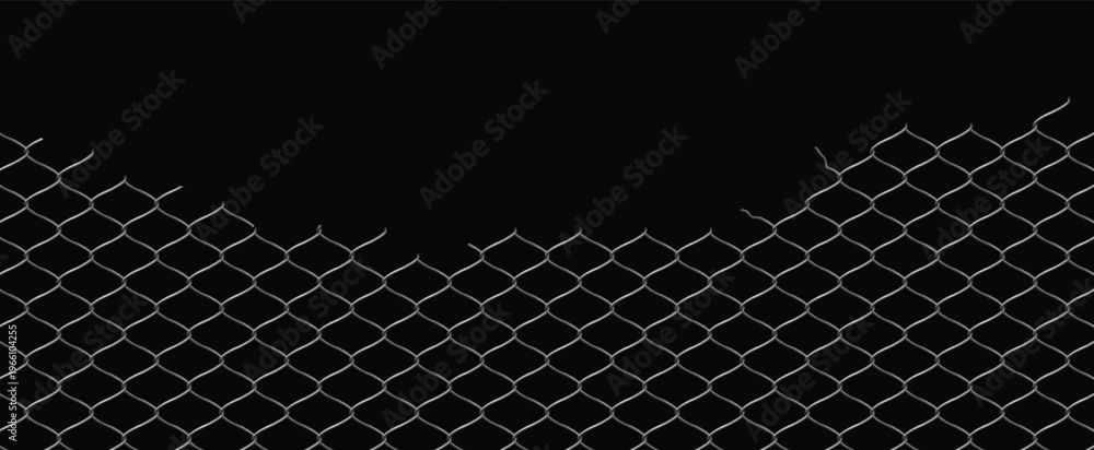 Broken wire net fence vector realistic illustration, steel chain link fence mesh with torn metal destroyed grid on black #1966104255
