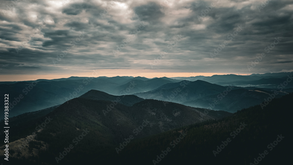 Brooding clouds hang over a chain of shadowed peaks while a thin ribbon of light glows at the horizon turning the sweeping ranges into a dramatic study of distance weather and time #1919383322