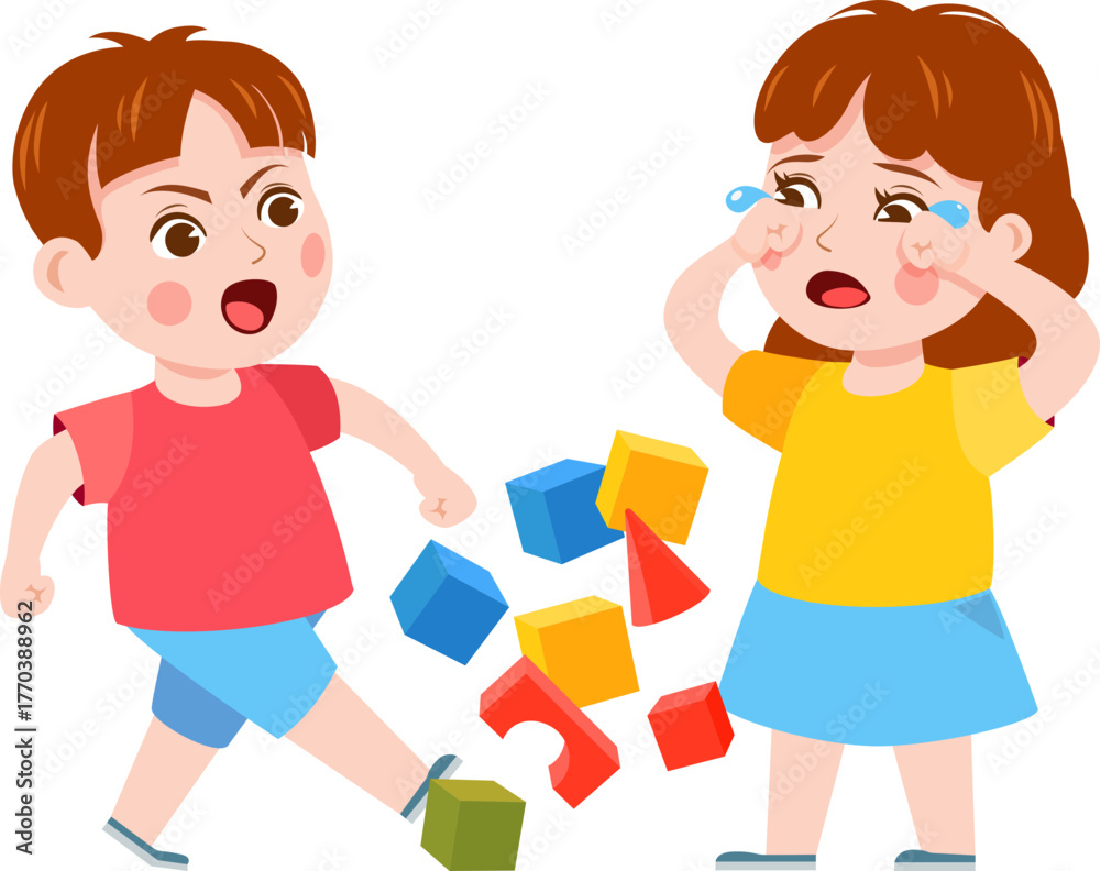 Brother and sister fight. Cartoon siblings angry, quarrel and cry. Kids fighting over a toy, playing together and holding hands vector set #1770388962