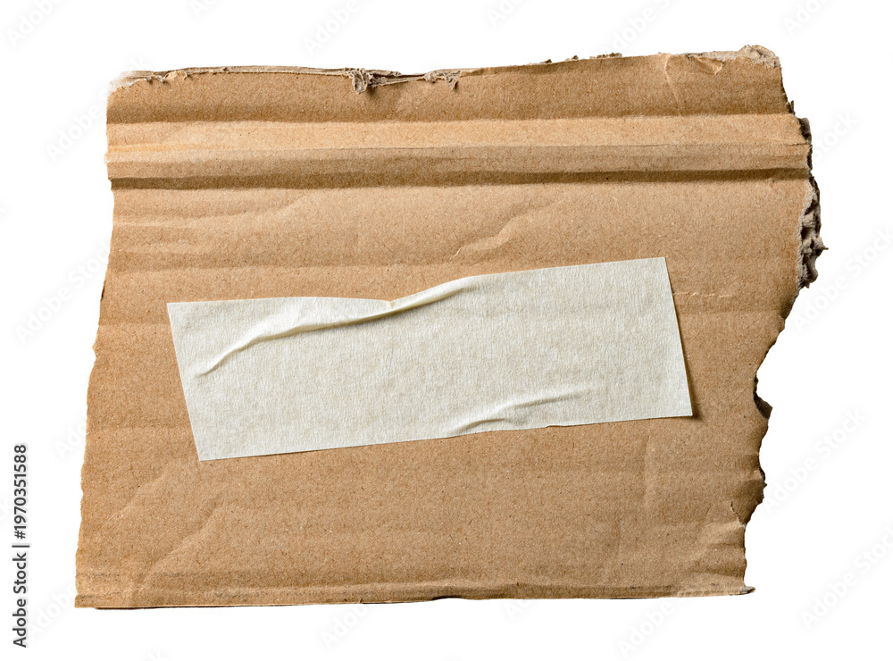 Brown corrugated cardboard torn ripped and crumpled with blank adhesive sticky tape and copy space for text, transparent png background design element #1970351588