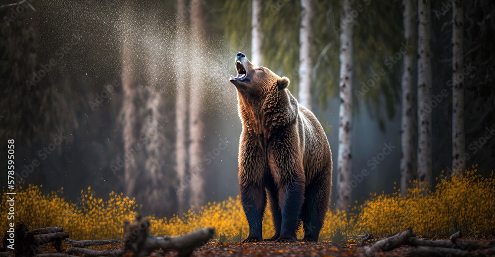 Brown grizzly bear roaring in the morning forest. digital ai art #578595058