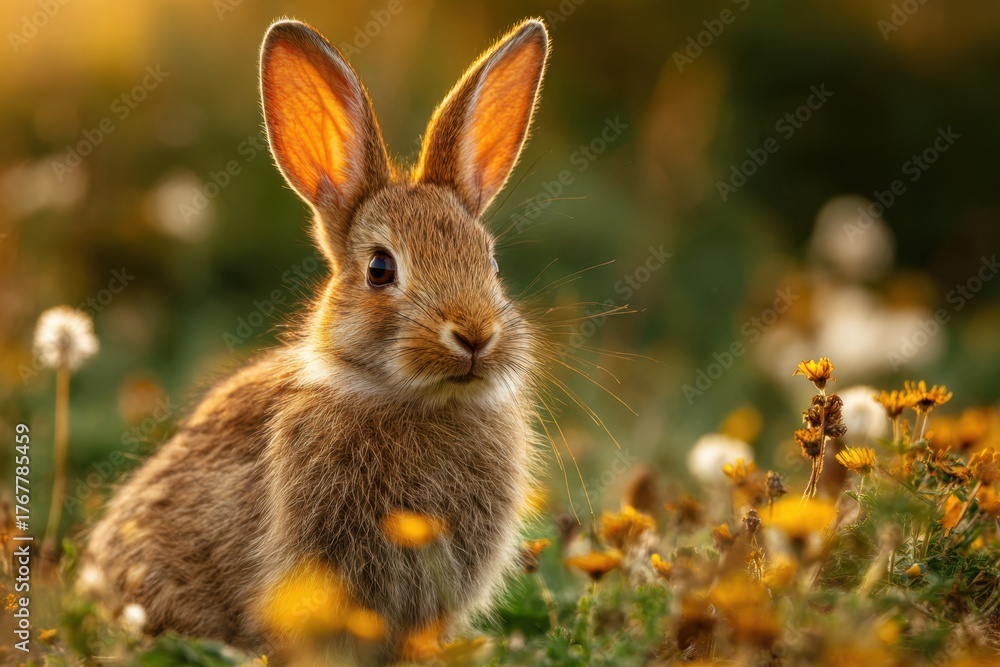 Brown rabbit sitting among vibrant wildflowers in a sunlit meadow, showcasing its soft fur and attentive expression, embodying the beauty of nature and wildlife #1767785459