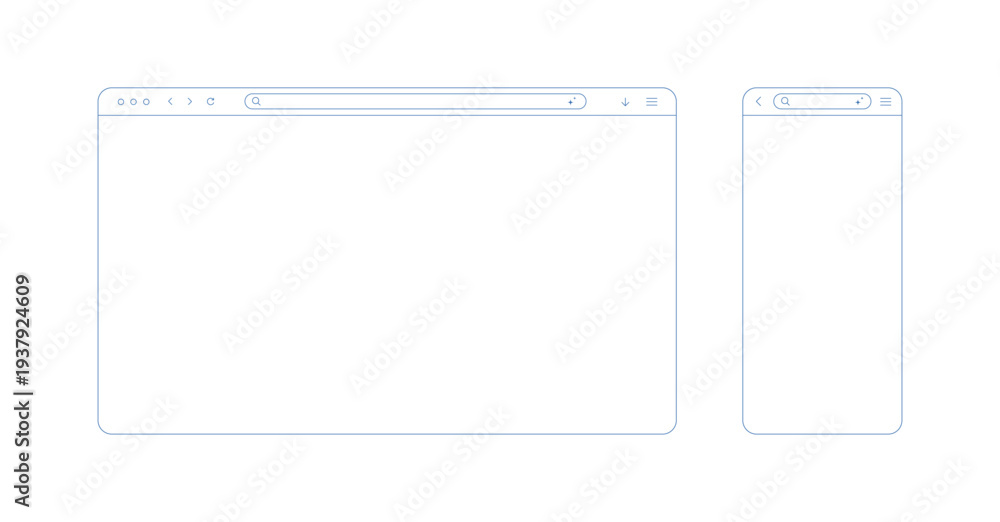 Browser window outline light for web pc and mobile phone. Browser screen mockup for desktop, pad and computer. Screen frame with arrow and menu icons and search line, vector illustration. #1937924609