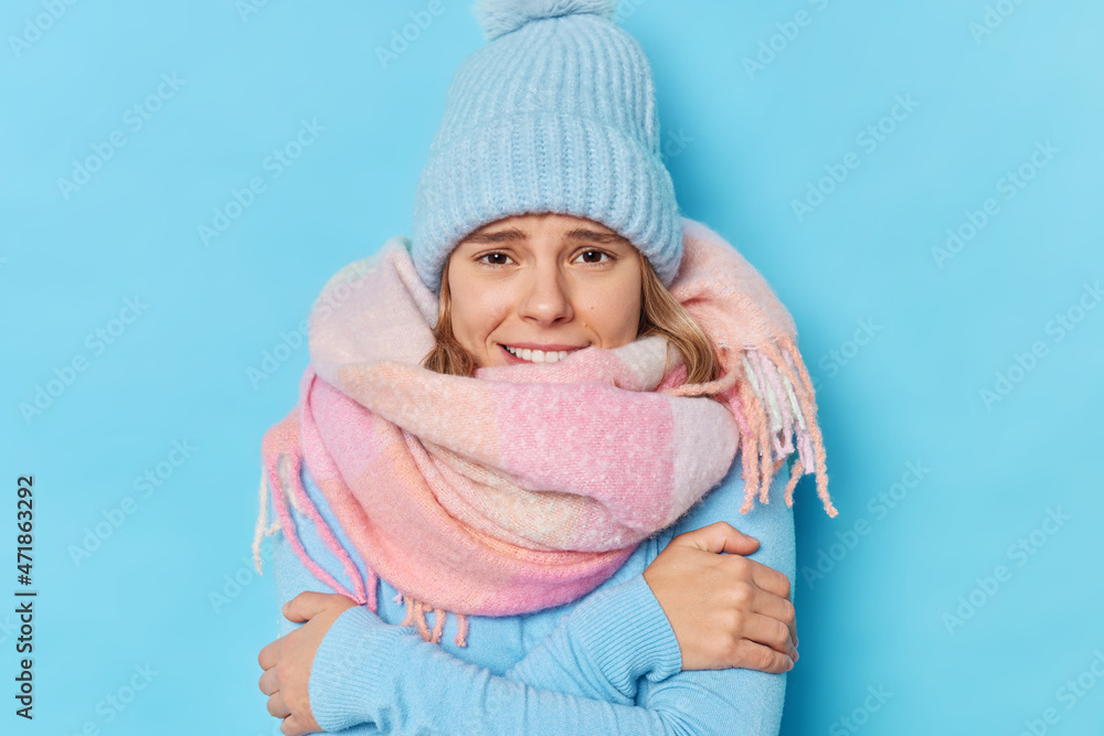 Brr how freezing there. Young woman cuddles and feels cold asks to turn on heater wears knitted hat warm scarf around neck walks during frozing winter day shivers isolated over blue background #471863292