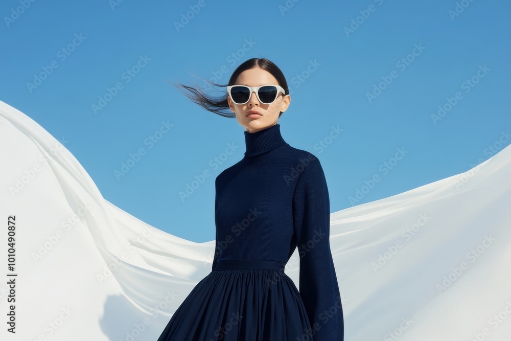Brunette model posing with white sunglasses and blue sky #1010490872