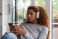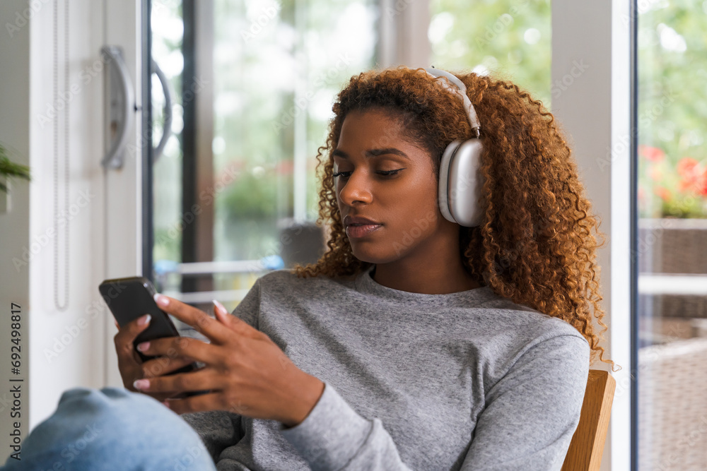 Brunette multiracial woman wearing casual home clothes resting on armchair #692498817