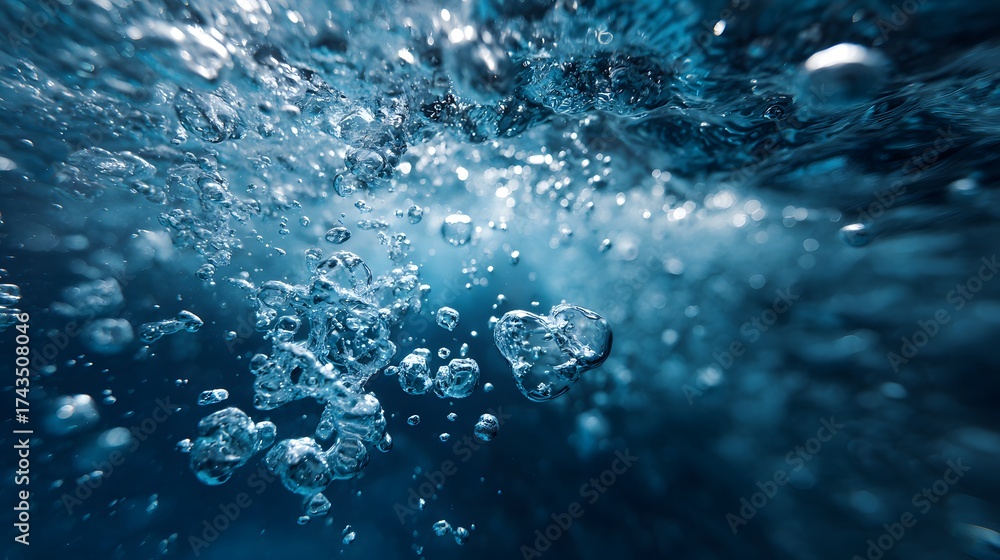 Bubbles rising underwater with a captivating display of light refraction, showcasing fluid movement, transparency, and a gradient of blue hues. #1743508046