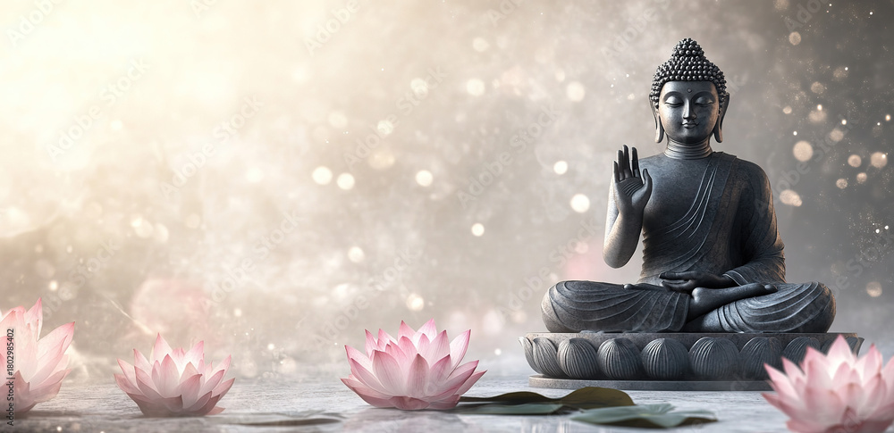 buddha statue meditation soft color and blur style in the shiny bokeh. Generative AI #1802985402