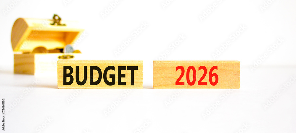 Budget 2026 symbol. Concept words Budget 2026 on beautiful wooden blocks. Beautiful white paper background. Beautiful wooden chest with coins. Business and budget 2026 concept. Copy space. #1756364130