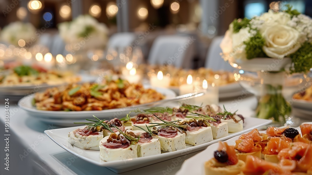 Buffet élégant avec canapés au saumon et fromage sur table festive #1918034024