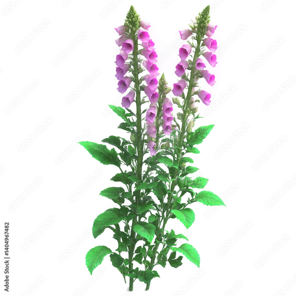 Bunch of foxglove flower with vibrant leaves isolated on transparent background in 3D transparent background isolated png stock #1404967482