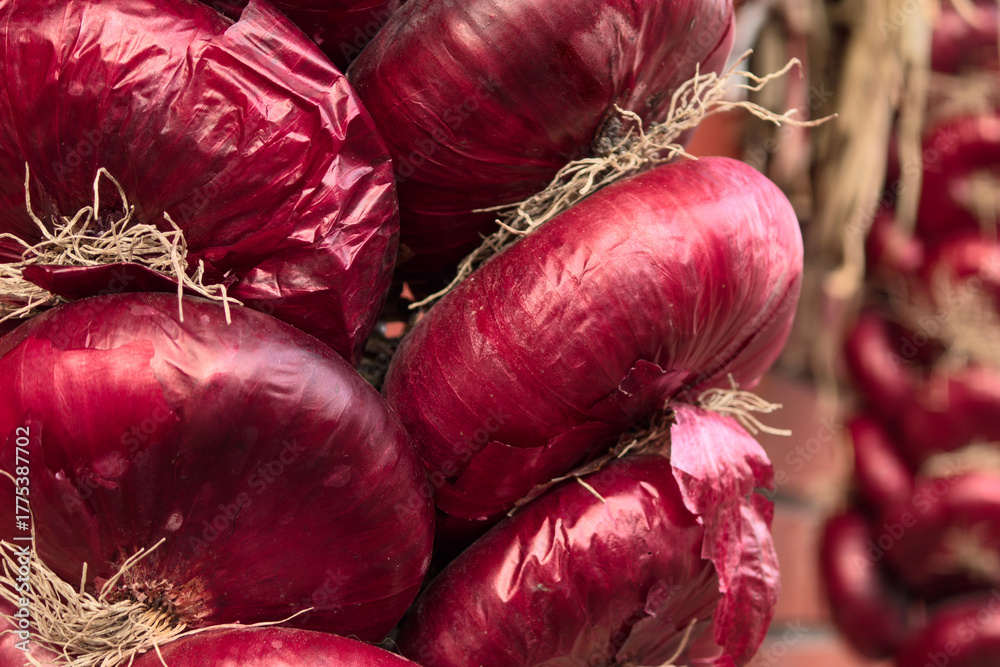 Bunch of fresh red onions with papery skin and roots #1775387702