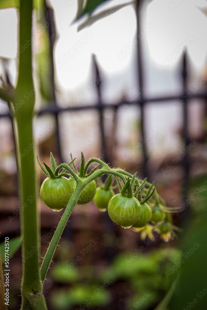 Bunch of Green Baby Tomatoes on a branch #507742570