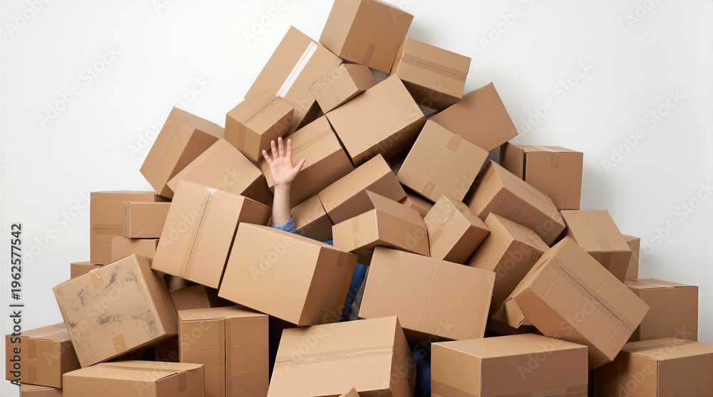 Buried person reaching out from under huge pile of cardboard boxes. Overwhelming clutter and consumerism concept. #1962577542