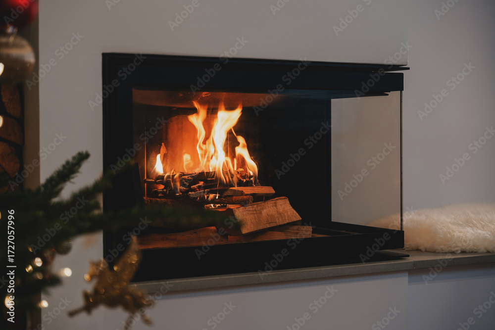 Burning Firewood in Modern Glass Fireplace for Cozy Winter Ambiance #1727057996