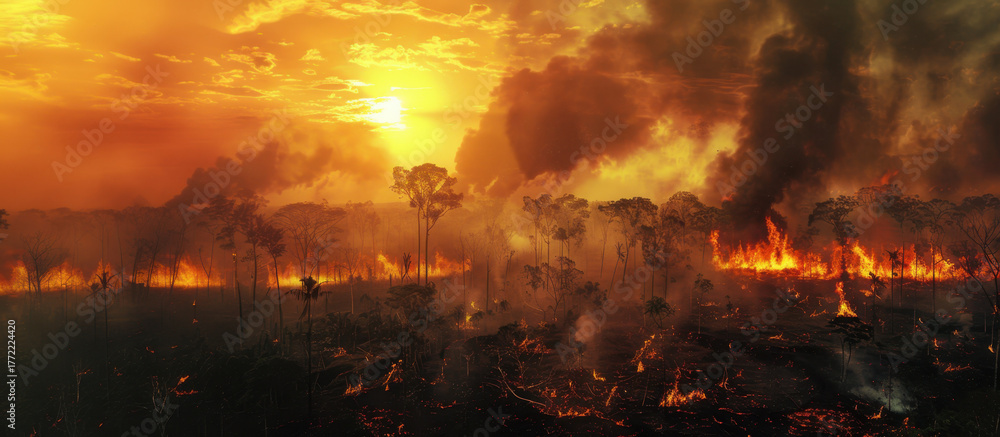 Burning Scenery: A panoramic vista of a raging inferno, the sun casting an orange hue, with flames consuming a vast terrain, presenting a vivid depiction of devastation and destruction. #1772224420
