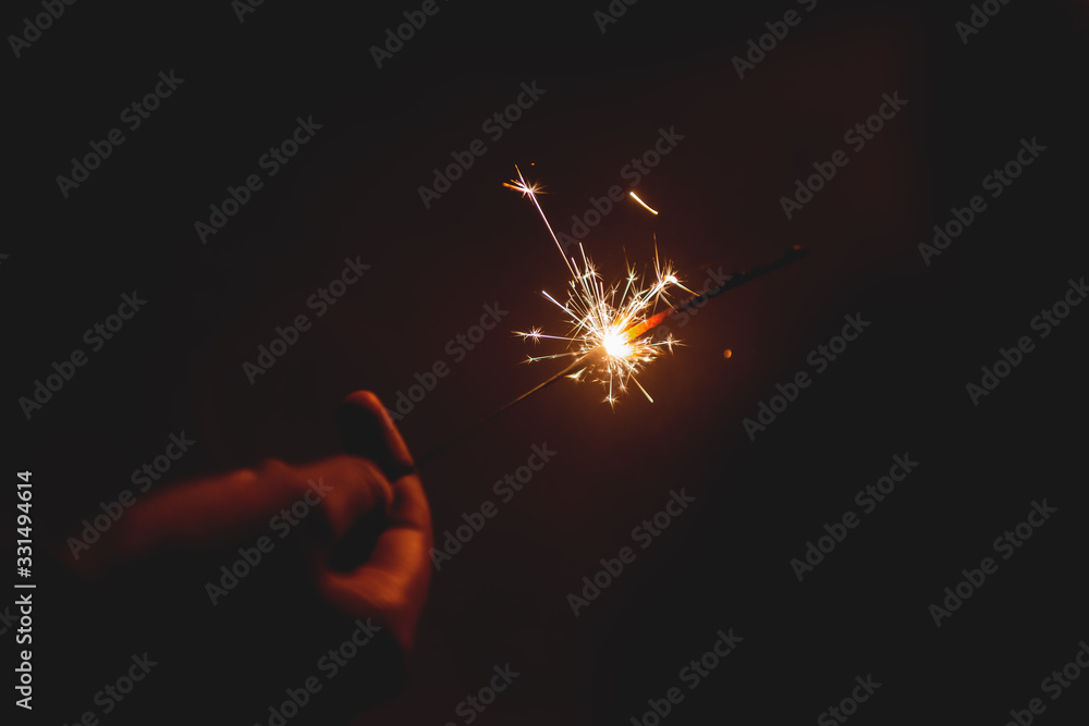 Burning sparking stick starlight fireworks pyrotechnic dark black warm background. #331494614