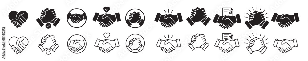 Business agreement handshake icon. Containing relation, cooperation, contract deal, success, greeting, respect, teamwork, friendship, partnership, trust, welcome. Vector illustration #1114410372