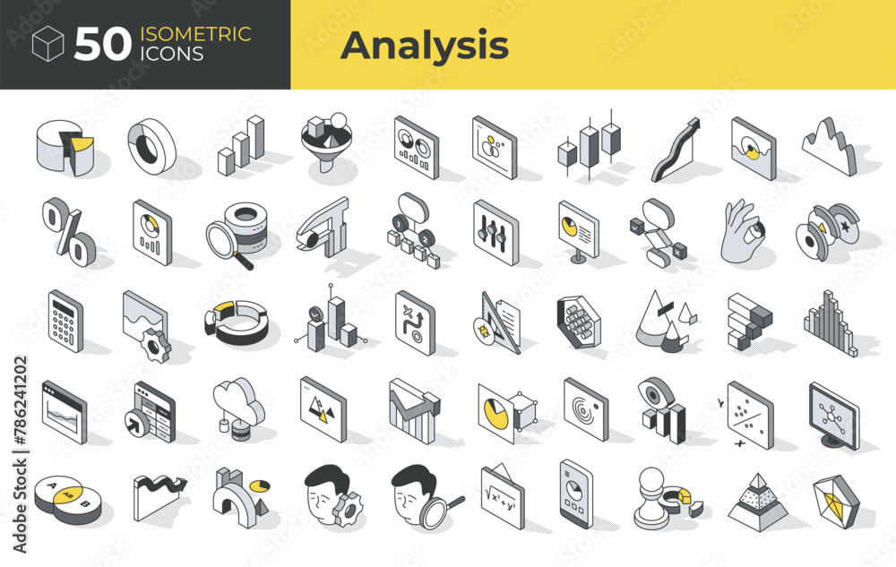 Business and data analysis. Isometric linear icons: analysis to infographics, analytics, and statistics. Collection includes charts, graphs, metrics, and more. Vector illustration #786241202