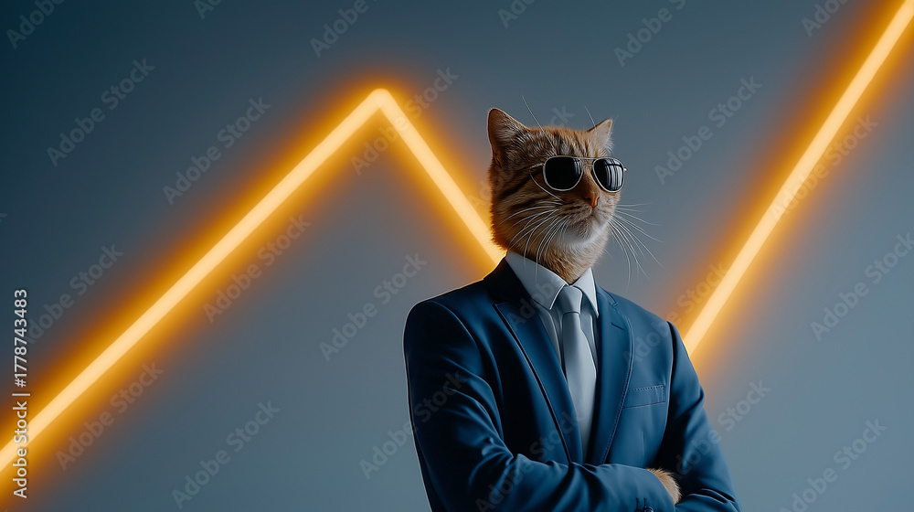 Business Cat Icon: A business cat, dressed in a tailored suit and sunglasses, stands confidently before a rising graph, ready to illustrate business concepts. #1778743483