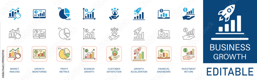 Business Growth and Financial Analytics icon set. Includes symbols for Market Analysis, Profit Metrics, Investment Return, and Growth Acceleration. Vector icons for data dashboard. #1904624765