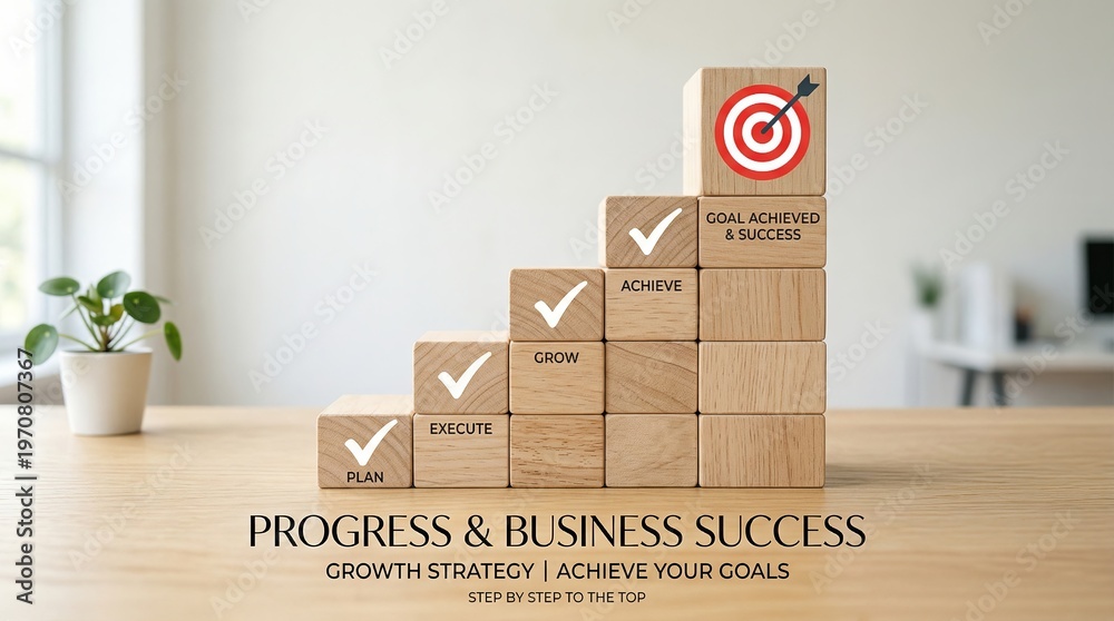Business growth and goal achievement strategy concept with wooden blocks stacked as stairs showing progress from plan to execution and success with a target icon on a bright office desk. #1970807367