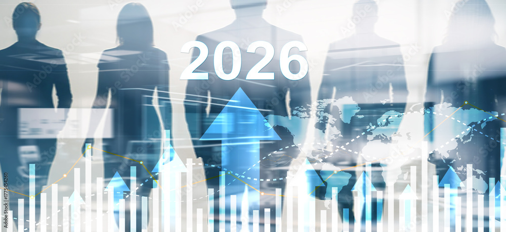 Business growth concept with office worker silhouettes against abstract rising arrows and 2026 year #1775454260