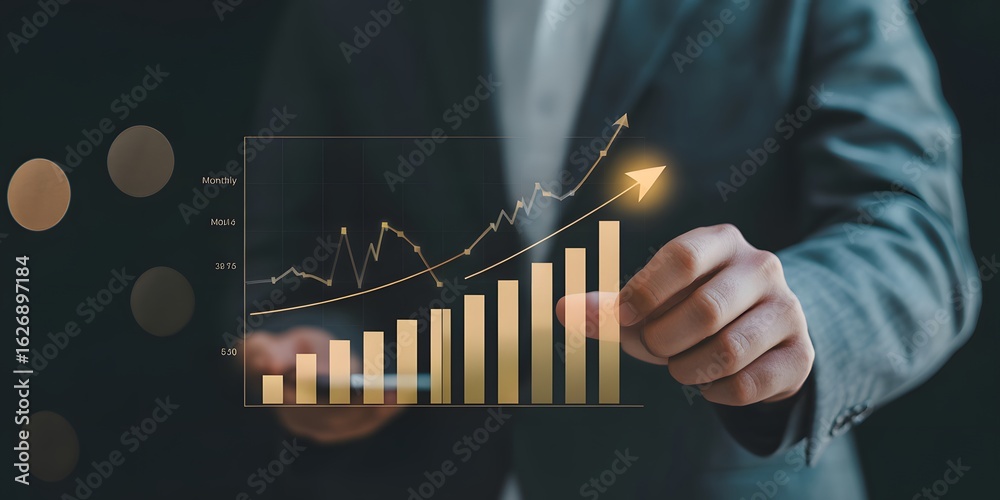 Business Growth with Upward Trend: A businessperson in a sharp suit presents a holographic graph illustrating an upward trajectory, highlighting the potential for growth and success. #1626897184