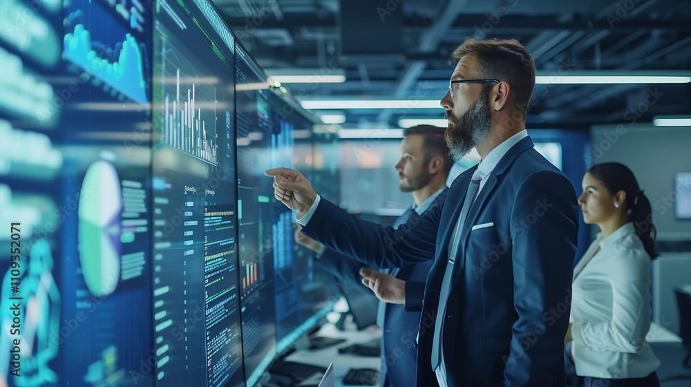 Business man depicted corporate executive leading team of business professional through critical business transformation project ensuring smooth implementation alignment strategic goal hightech office #1109352071