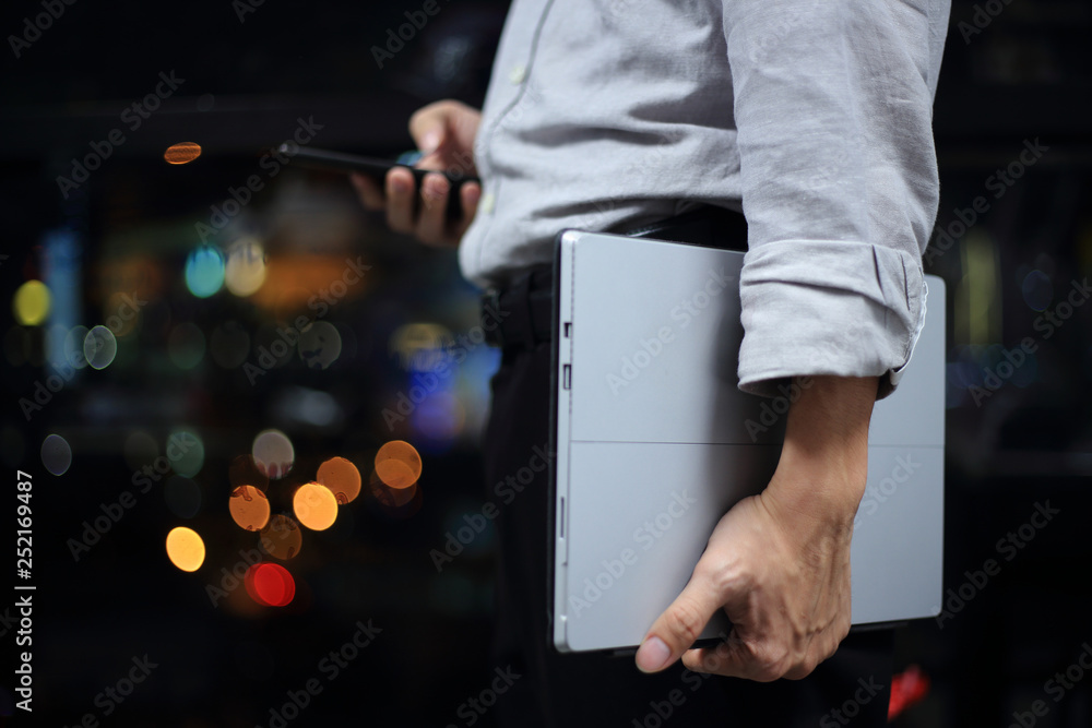 business man prepare for big meeting. man carrying computer notebook and checking on smartphone. businessman in a modern office with bokeh defocus lights from city outside of the window. #252169487