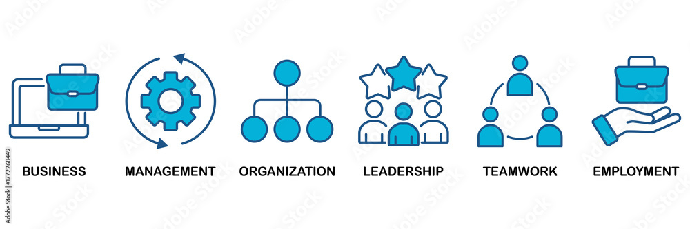 Business management icon set Blue Monochrome Flat Design concept for business, management, organization, leadership, teamwork and employment #1772268449