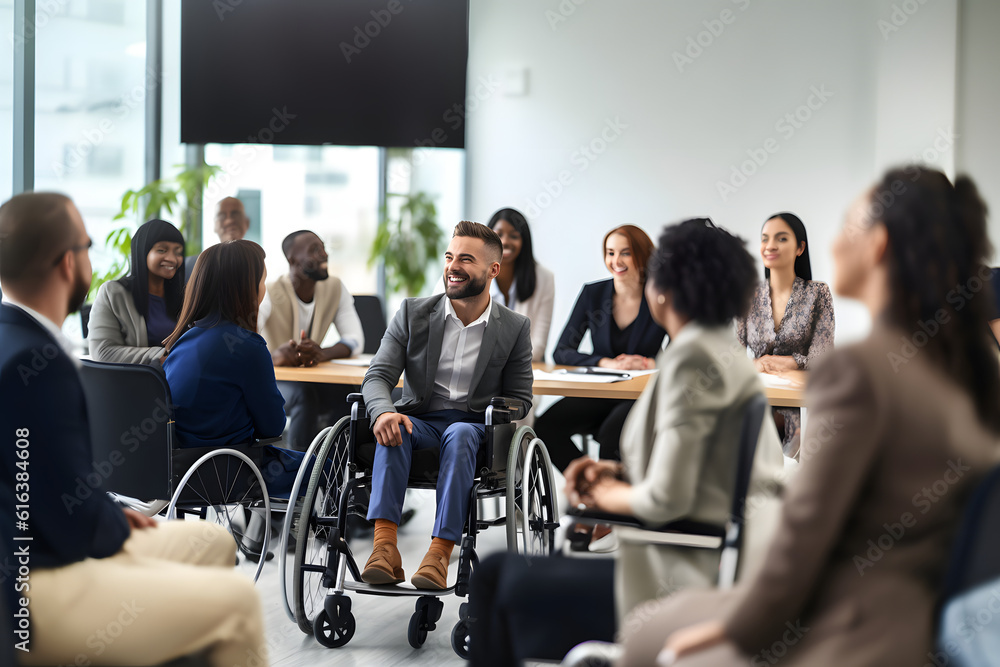 business people in wheelchair having business meeting with team at modern office. A group of young freelancers agree on new online business projects #616384608