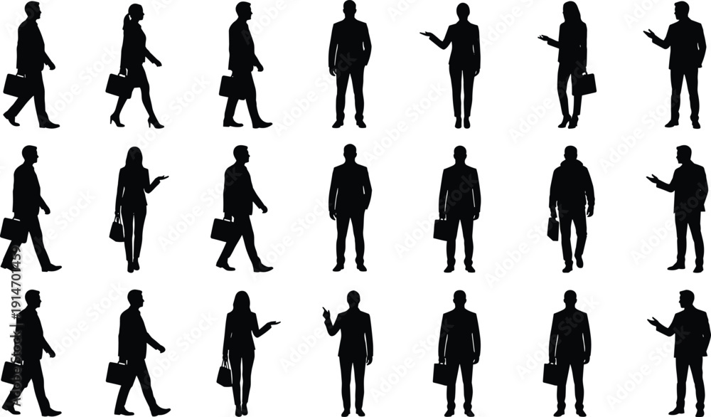 Business people silhouette set, corporate men and women with briefcases walking and standing, professional office flat vector illustration #1914701459