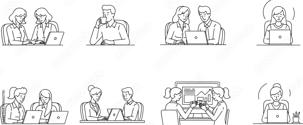 Business people working on laptops, office teamwork collaboration scenes, coworkers meeting discussion, remote work and productivity line illustration #1936127795