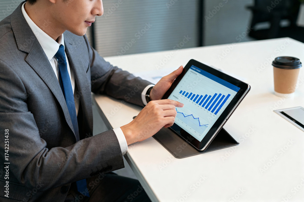 Business person analyzing data on tablet with charts visible: Finance, Consulting, Technology, Business Services #1742251438