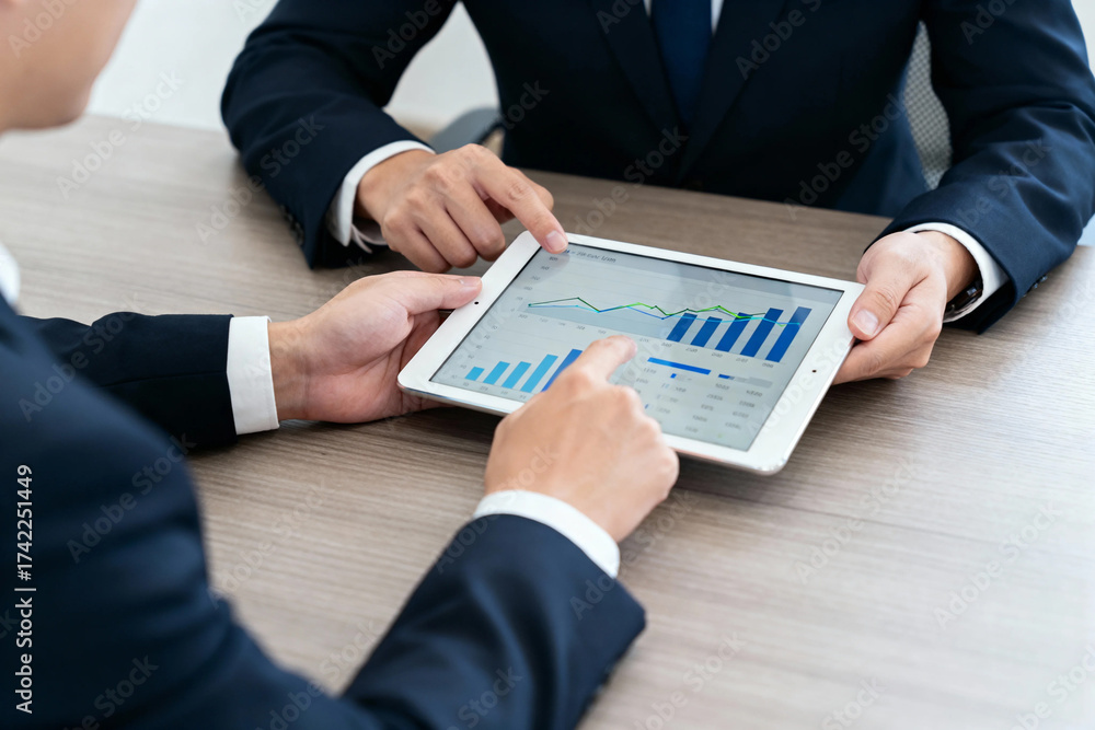 Business person analyzing data on tablet with charts visible: Finance, Consulting, Technology, Business Services #1742251449