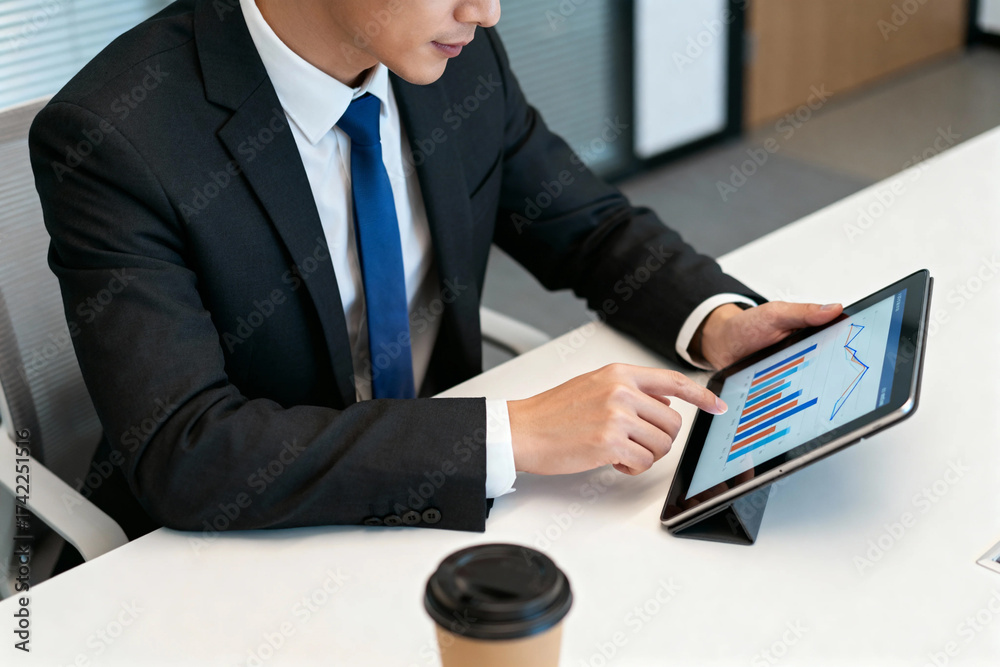 Business person analyzing data on tablet with charts visible: Finance, Consulting, Technology, Business Services #1742251516