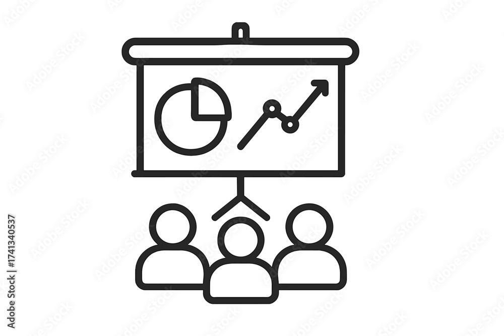 Business presentation vector icon with pie chart and growing line graph symbols, linear style diagram illustration of teamwork and data analysis on transparent background #1741340537