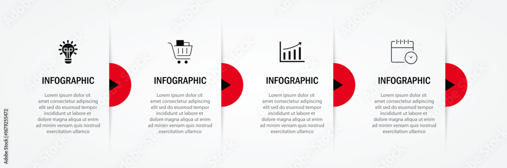 Business process visualization with 4 steps white diagram in two row | Arrow indicator vector illustration with icon | Modern elegant design for presentation, web, corporate with red color #1679255472