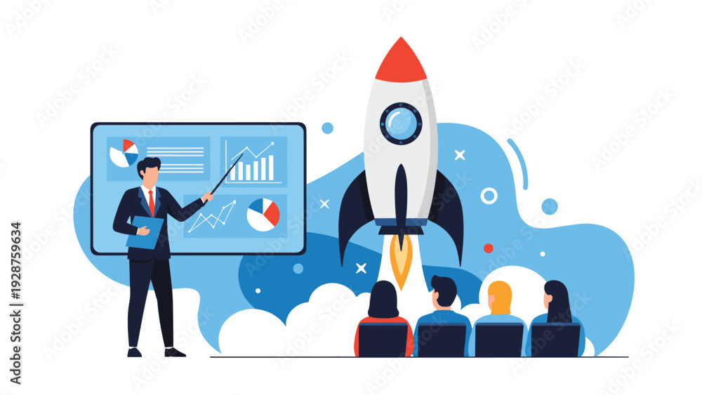 Business professional presents a startup plan with a rocket launching in the background to an audience of investors. #1928759634