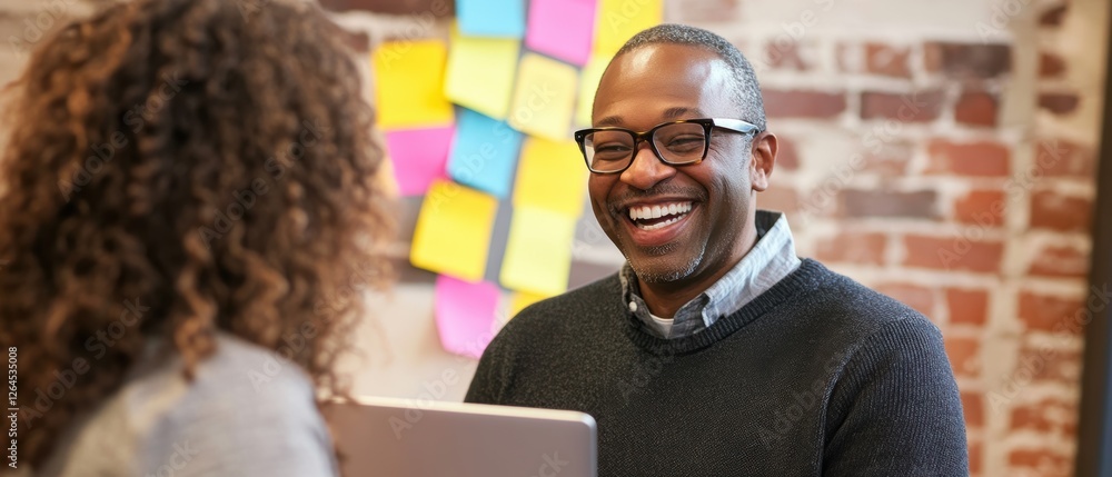 Business professionals engaged in conversation at modern office, smiling and collaborating on project ideas with laptop and sticky notes in background #1264535008