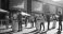 Business professionals interact with digital kiosks in modern outdoor setting with large screens displaying graphs #1918792112