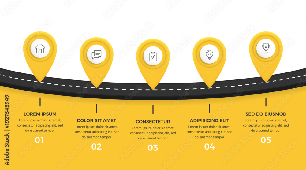 Business roadmap infographic template with five location pins on curved road with yellow background #1927543949