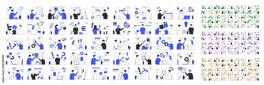 Business scene in four colors. Mega set. Collection of scenes:HR specialist,data analytic,FAQ,tax,new idea,start up,check list,online shop. Business people in different situation. Vector illustration. #683468489