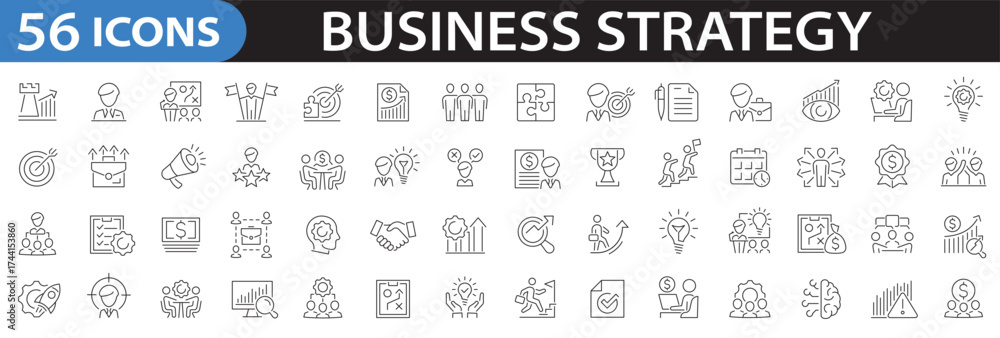 Business strategy line icon set. Startup, market analysis, plan, teamwork, partnership, office, goal, presentation, growth and more. Vector illustration #1744153860
