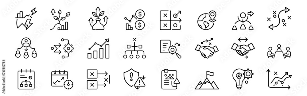 Business strategy outline icon set – planning, growth, analysis, decision making, leadership, risk management, teamwork, and goal achievement symbols #1765382788