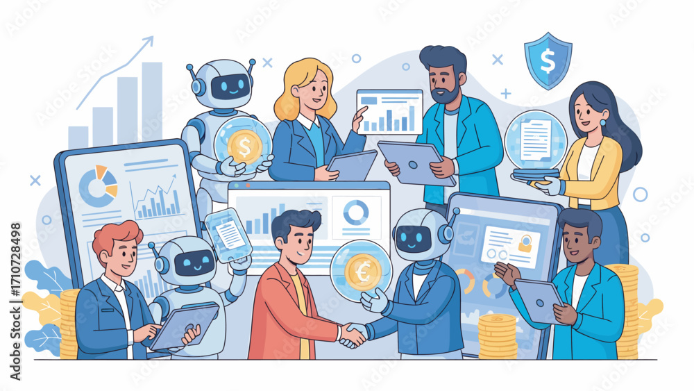 Business team and robots collaborate on financial strategies in modern office, showcasing ai integration and teamwork for future success. #1710728498
