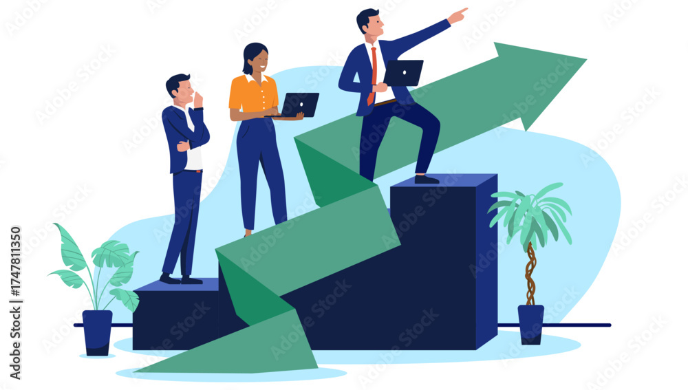 Business team stands on a rising green arrow pointing forward, with a leader pointing into the distance, symbolising growth and future direction in a flat design vector illustration #1747811350